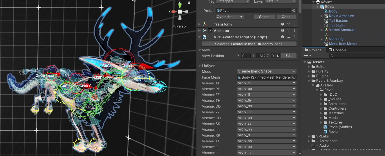 The Révia has a little bit of story and reason put behind its upbringing! This base was originally started after the end of Furality Somna (We are in no way officially associated to Furality) after seeing the amazing creatures the Furality team put together in the Furality worlds, and already knowing there's a severe lack of heavily polished puppet avatars targeted as being used as a full-featured main avatar that people would really love and be able to customize however they want! It's targeted for desktop or VR use, as a floaty canine, snake, noodle dragon, or just a classic run-of-the-mill dragon! You can meld this base into a variety or hybrid of different species to fit whatever character you're going for. It's an amazing base for those of you who want to dance around and have a lot of energy, and those of you who want that flow and liveliness of full body without having full body, or on a lazy day when you don't feel like calibrating. If you're on Desktop mode with VRChat's new Selfie Expression using a camera, nobody will be able to tell whether if you're on Desktop or VR. It's extremely lively, different, and fun!
